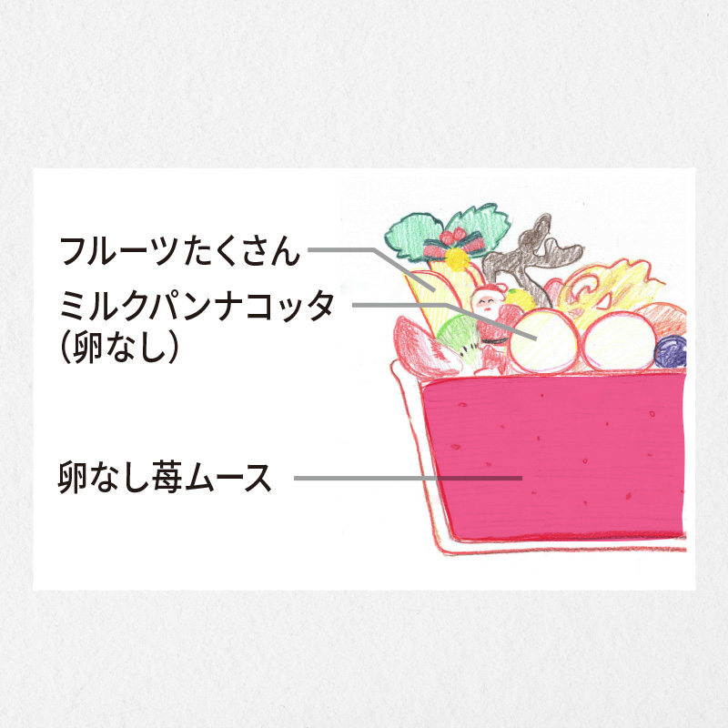 陶器のカップに卵を使っていない甘ずっぱい苺ムースを入れ、生クリームと色々なフルーツを飾りつけました。