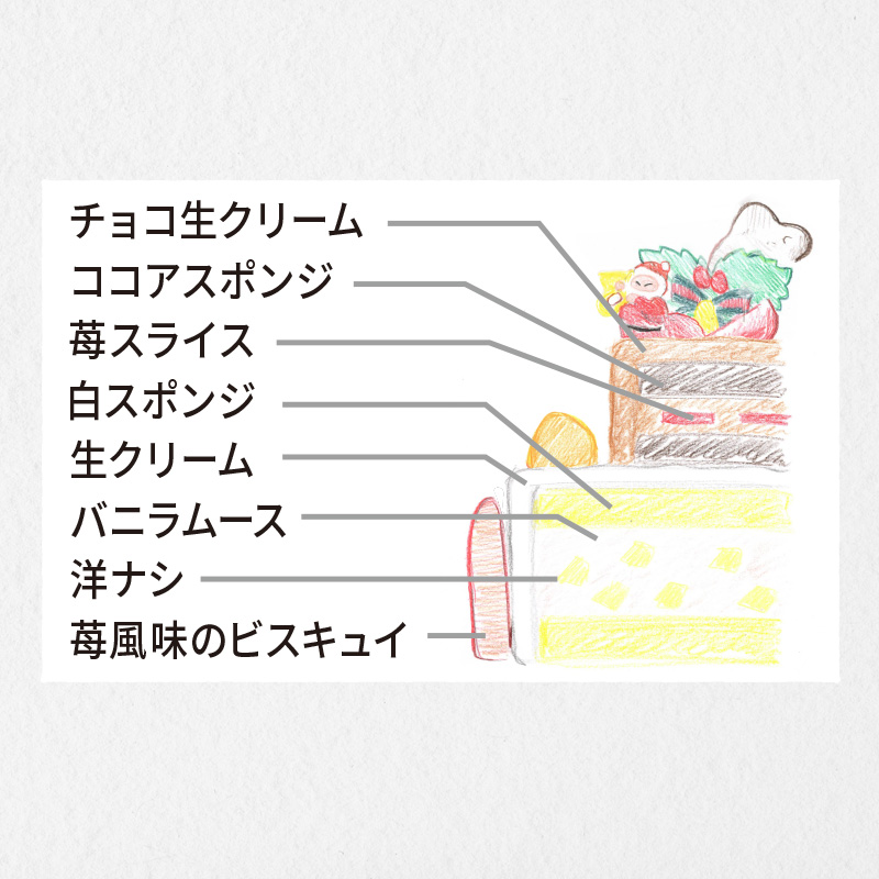 (下段はバニラムースの中に洋ナシ、上段は苺サンドのチョコ生クリームショート)